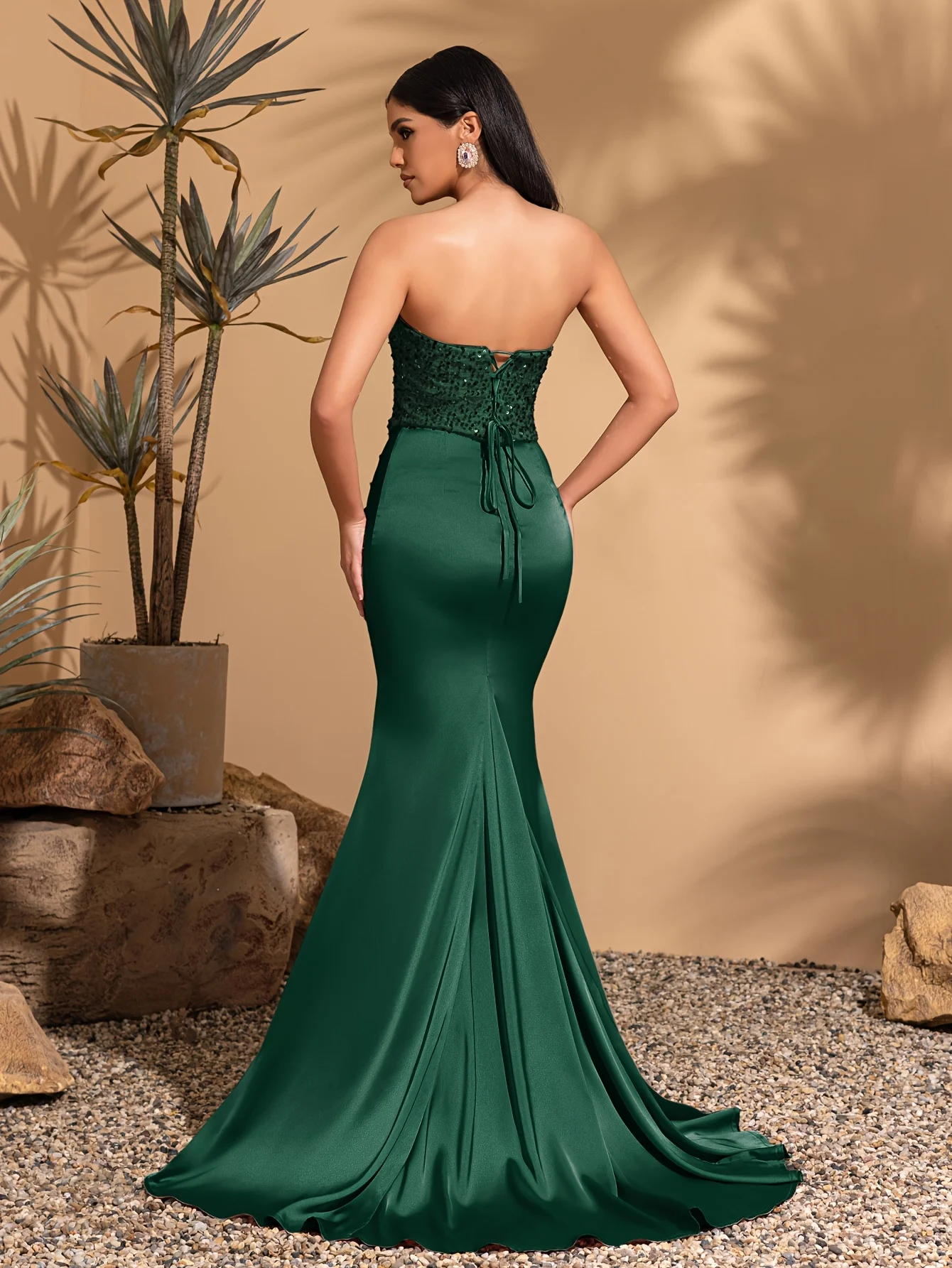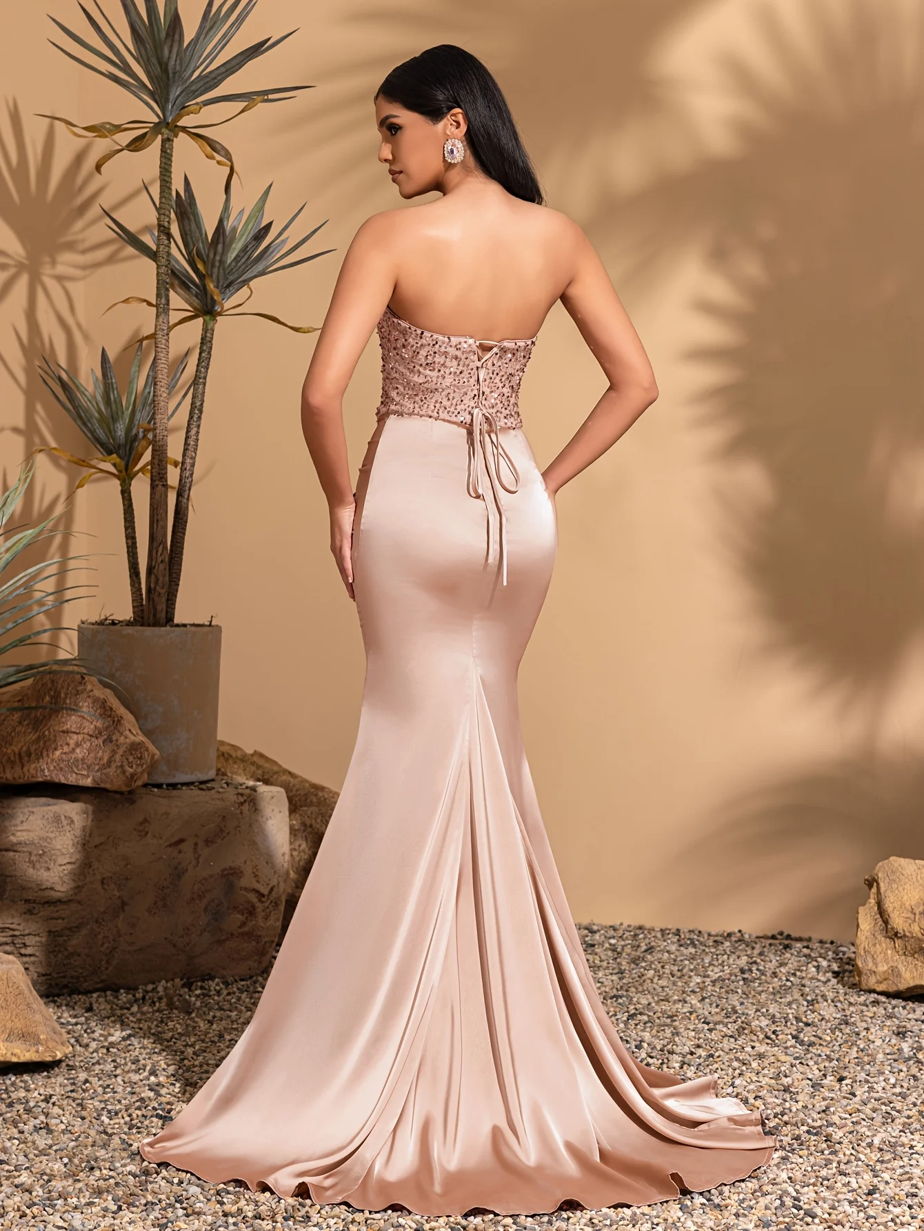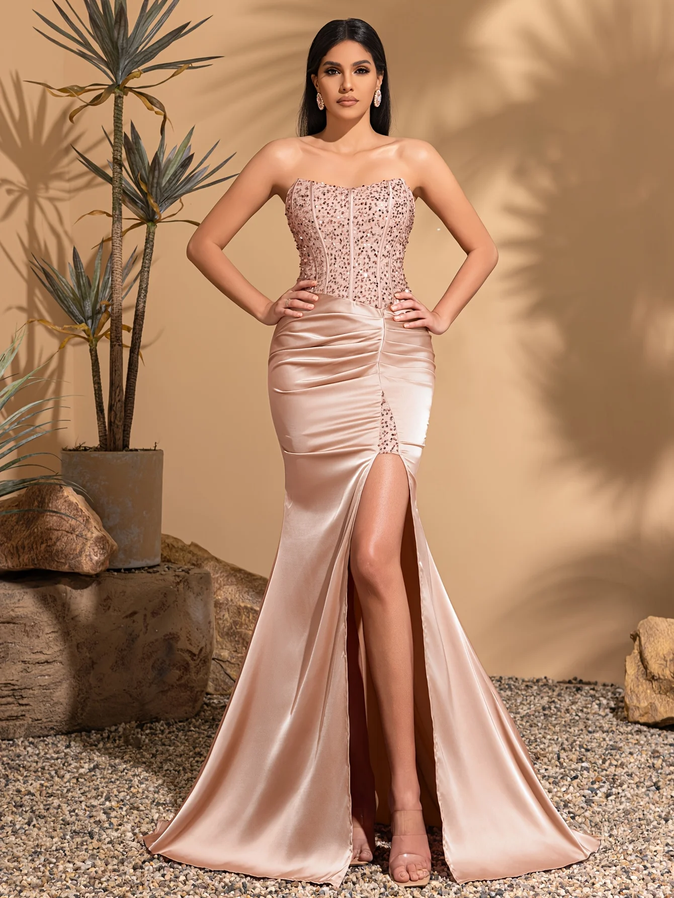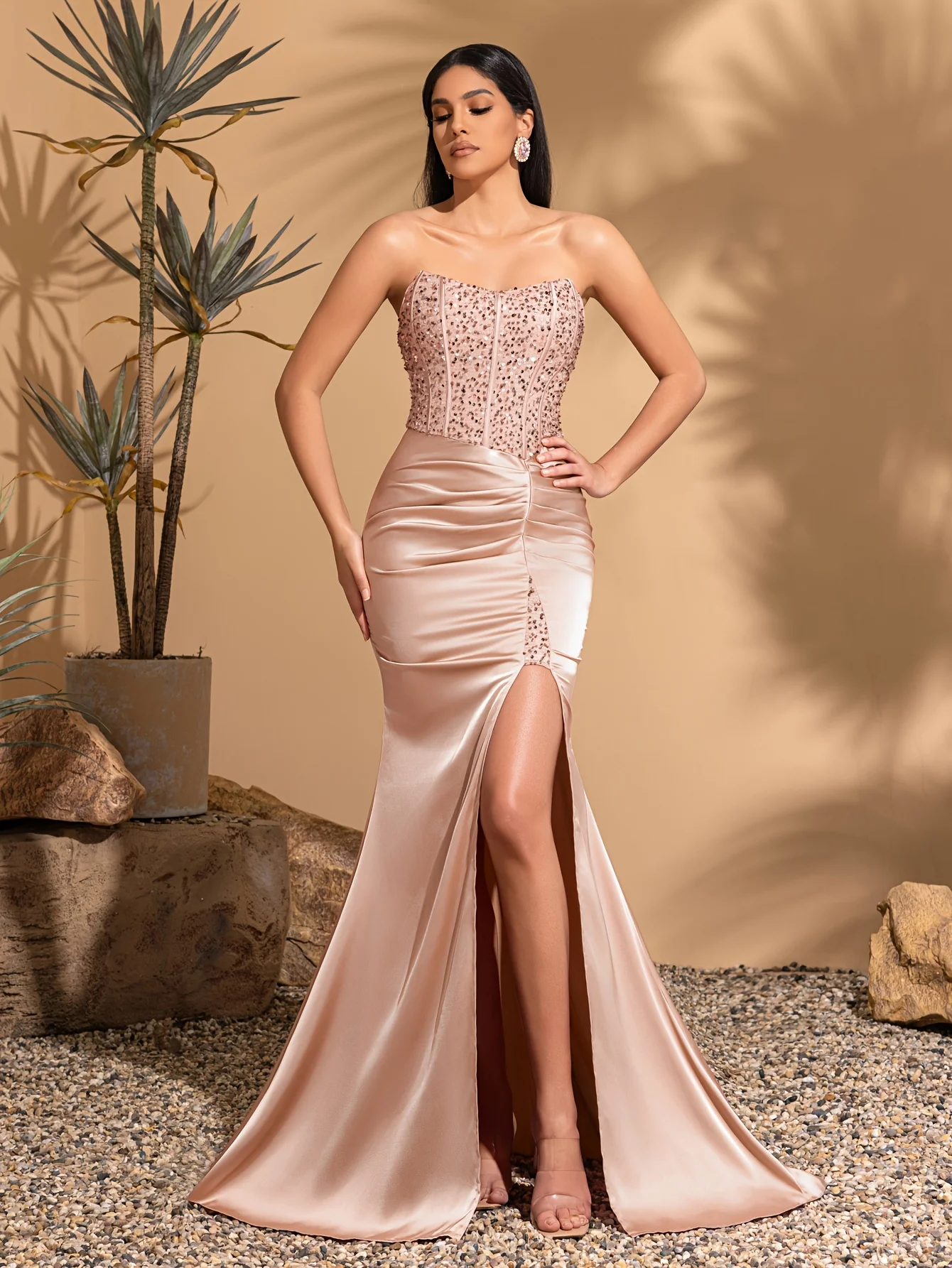 فستان ساتان فاخر بطيات انسيابية وتصميم عصري